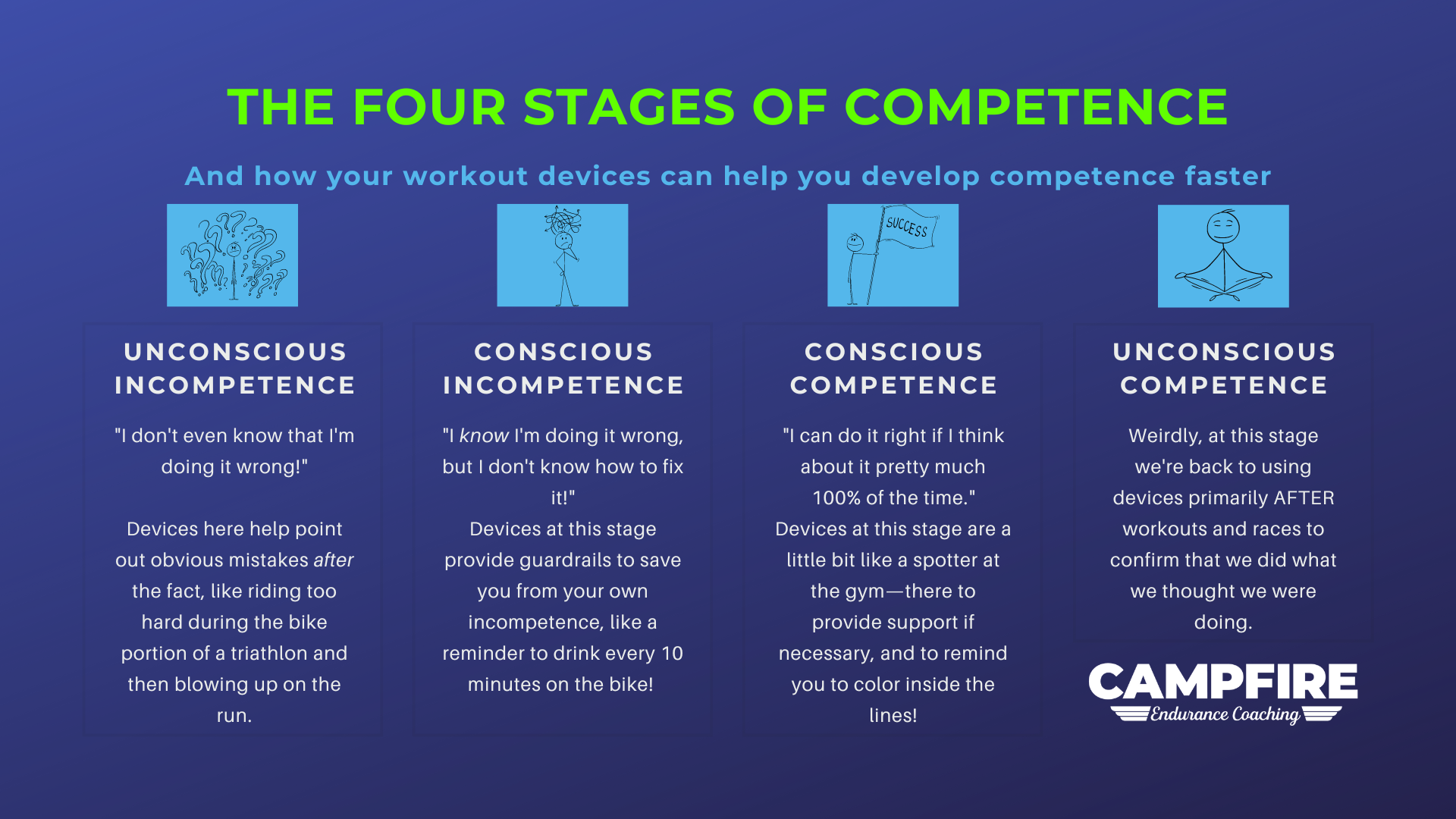 Many athletes have heard or seen the four stages of competence, which move from unconscious incompetence to unconscious competence, making stops at conscious incompetence and conscious competence along the way. When many of us start out in sport, we’re doing the sport simply because we like it and it’s fun. Maybe we have some natural aptitude, maybe we’re the Swedish Chef on skates, but at this stage we may not even WANT to get better. We make mistakes but we don’t care, because ignorance can be bliss. Usually, if an athlete does want to get better, a device at this stage can help us see the error, pointed out by a helpful coach or mentor: “Hey, see this section of your ride? This, right here, is why you didn’t run well—you were riding way too hard. It’s OK, don’t beat yourself up about it, you didn’t know! You’ll know to avoid that mistake in the future.” Now, armed with that information, our athlete spends a few weeks training, exploring their efforts and listening to how their body responds. Maybe they discover that at 200 watts their breathing gets too labored, and that when their breathing was that labored in the race their coach told them it was too much. Or maybe they use heart rate, and know now that efforts over 160 beats per minute (BPM) will leave them walking before the end of the run. The athlete goes to their next race and…gets it wrong again, but this time they return to their coach and say “Man, I could see I was over the effort again, but I felt so good! I didn’t think it would leave me walking again!” They saw their mistakes but made them anyway at this stage, the conscious incompetence phase. Next, having learned that their actions have real consequences for their body and their desired goals, the athlete sticks to the plan exactly, watching the watts, pace, or heart rate like a hawk during races and workouts, and results are…better but not great. What’s happening? This athlete, at the conscious competence phase, is hitting their prescribed numbers, but still something isn’t quite right. They come back to the coach with a quizzical expression on their face.