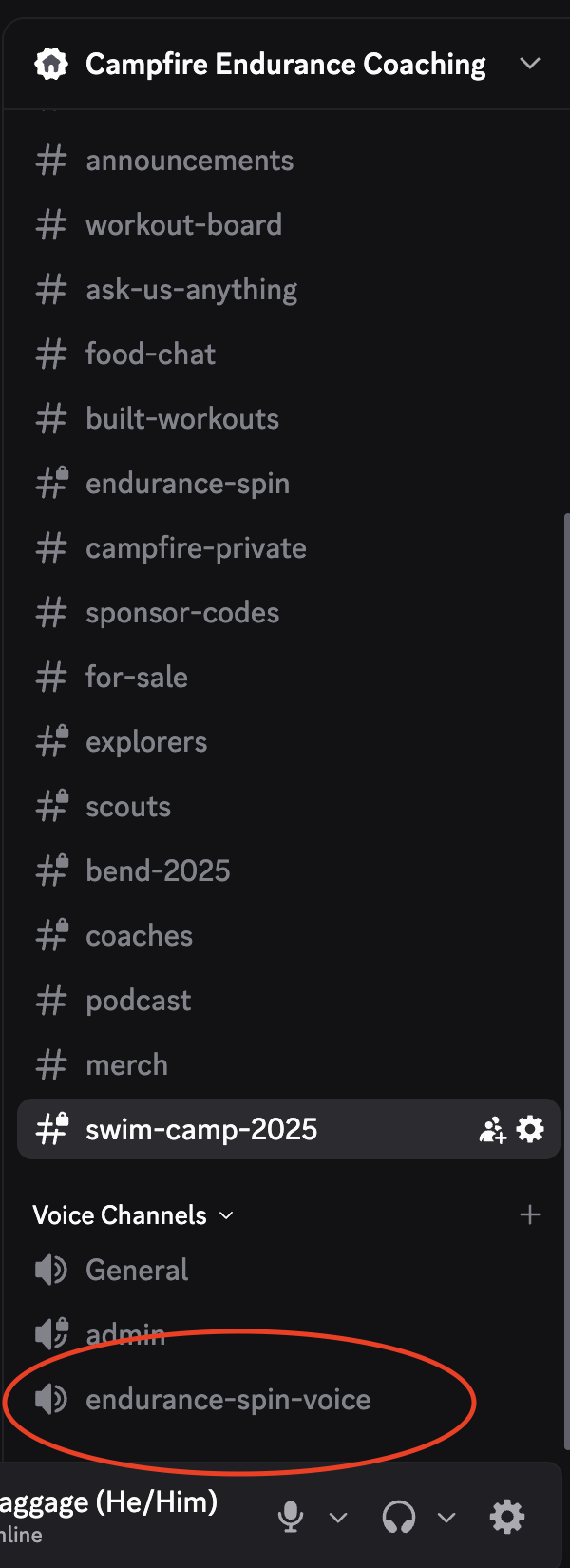 Before class, log onto Discord and come join us in the “endurance-spin-voice” channel. It’s down below the others and it looks like this: